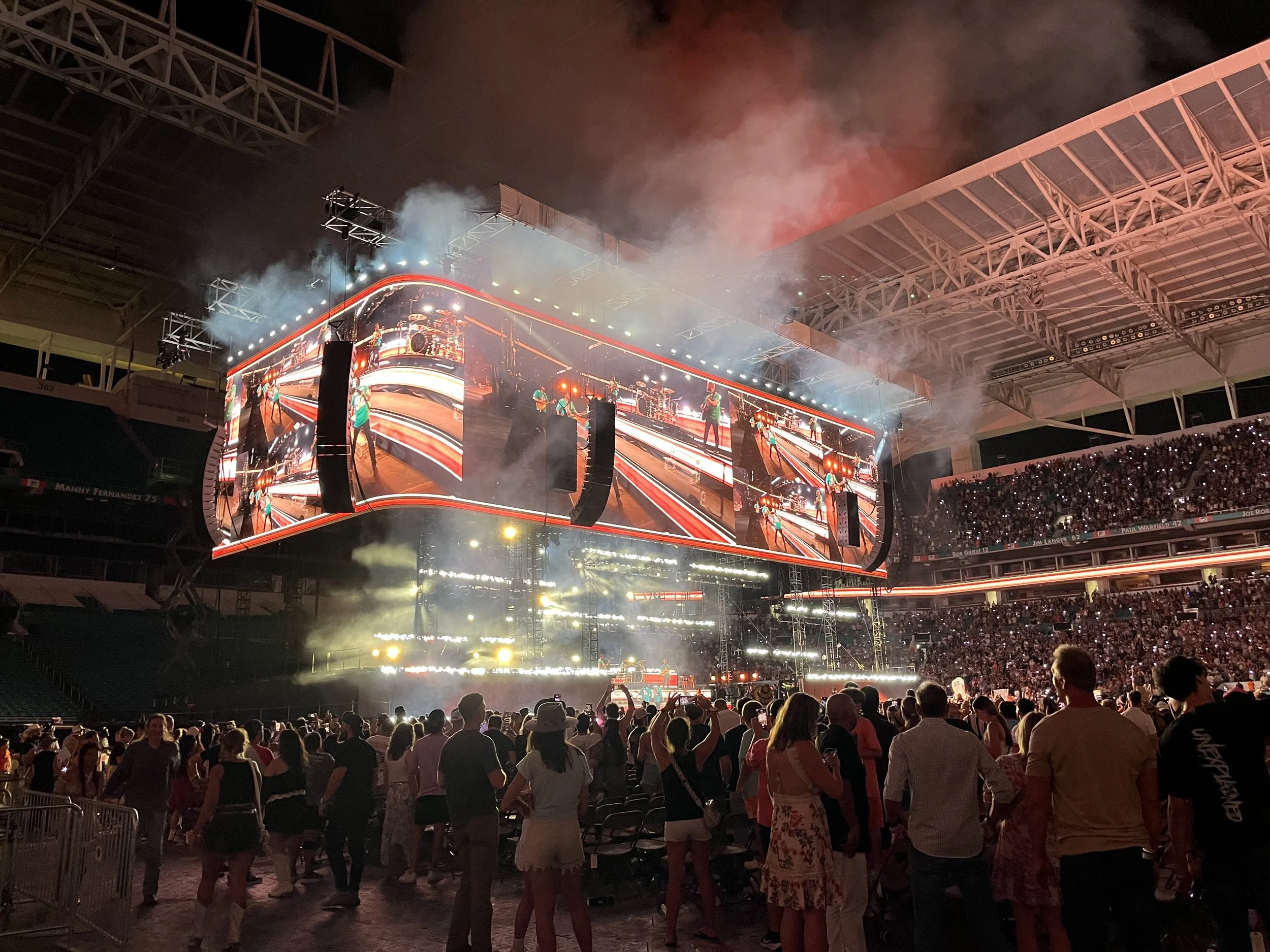 • Concert stage with multiple screens displaying colorful visuals, and people gathered in front.